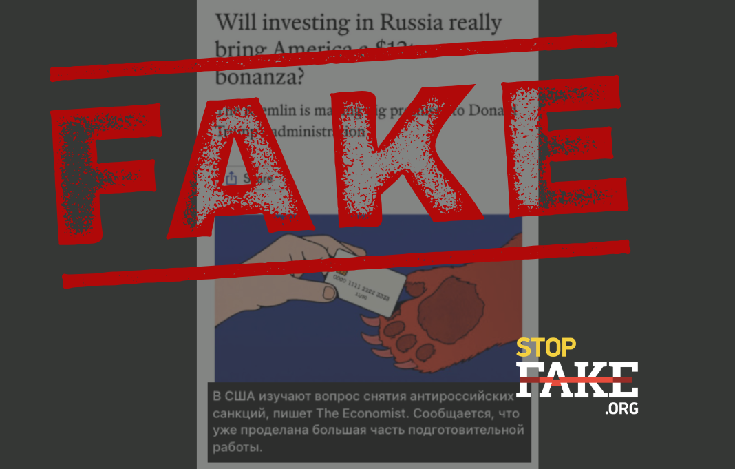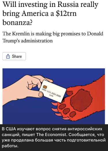 З посиланням на матеріал The Economist пропагандистські ресурси пишуть, що Штати буцімто готуються зняти санкції з Росії, а більшість підготовчої роботи вже завершена. У відповідь Росія буцімто пропонує США угоди на 12 трильйонів доларів.