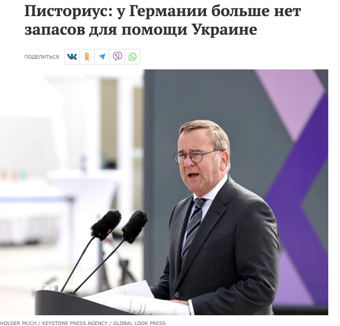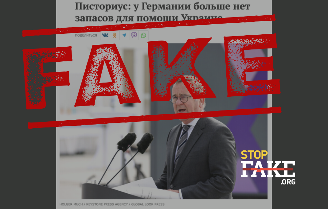Проросійським сегментом мережі та провладними російськими медіа поширюється нібито цитата Бориса Пісторіуса — міністра оборони Німеччини — про те, що у його країни закінчилися запаси для допомоги Україні.