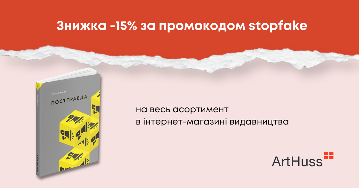 Тож спільно із видавництвом даруємо вам промокод stopfake на знижку -15% на весь асортимент в інтернет-магазині видавництва: https://www.arthuss.com.ua/shop/