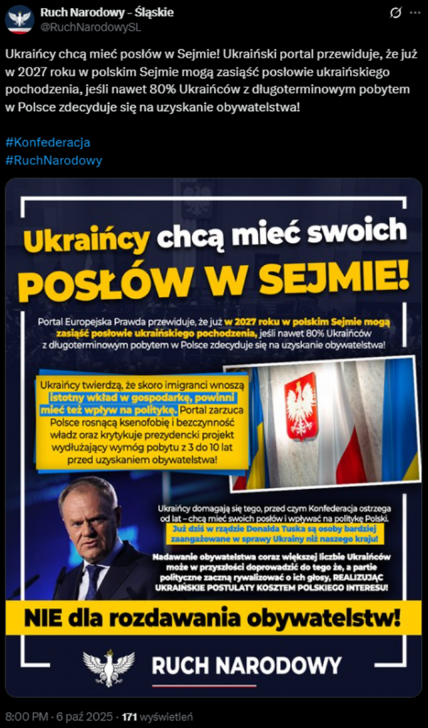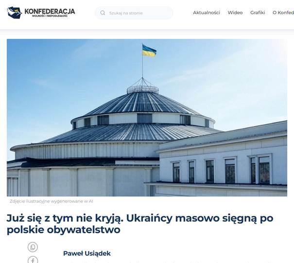 Політик Конфедерації Павел Усьондек опублікував на платформі X розлогий допис, у якому описує, нібито український інформаційний портал переконує, що українці повинні мати своє представництво в польському Сеймі вже у 2027 році.
