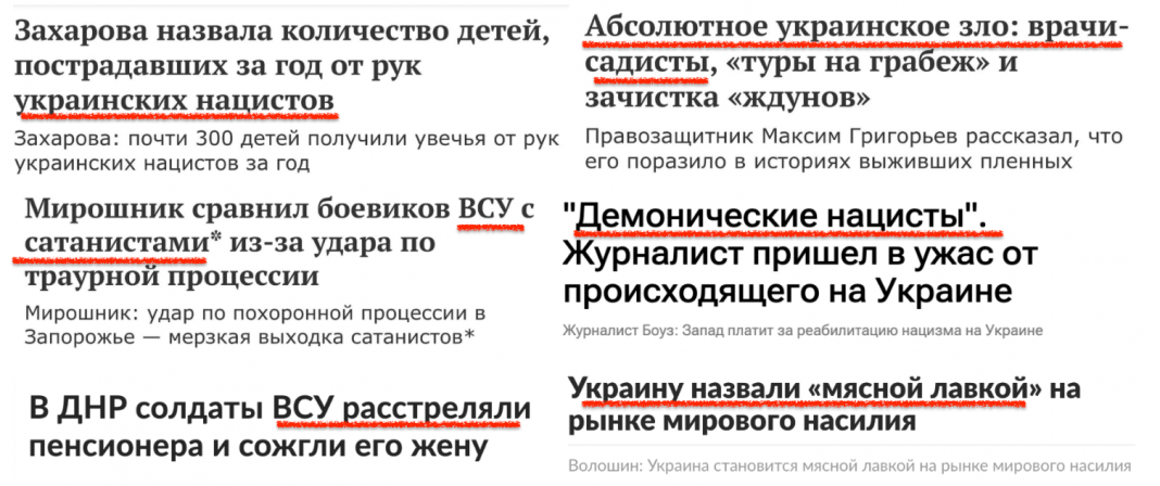 У російських новинних стрічках особливе місце посідають матеріали з мовою ворожнечі щодо українців. Пропагандисти системно розкачують локальну аудиторію та формують стійку асоціацію, що українці “нацисти”, і загалом дегуманізують українців як націю. Всі наративи, які запускає Росія у своїх медіа щодо України та українців, мають ознаки геноцидної риторики. Російська пропаганда особливу увагу приділяє формуванню негативного, сатаністичного образу ЗСУ та Володимира Зеленського.