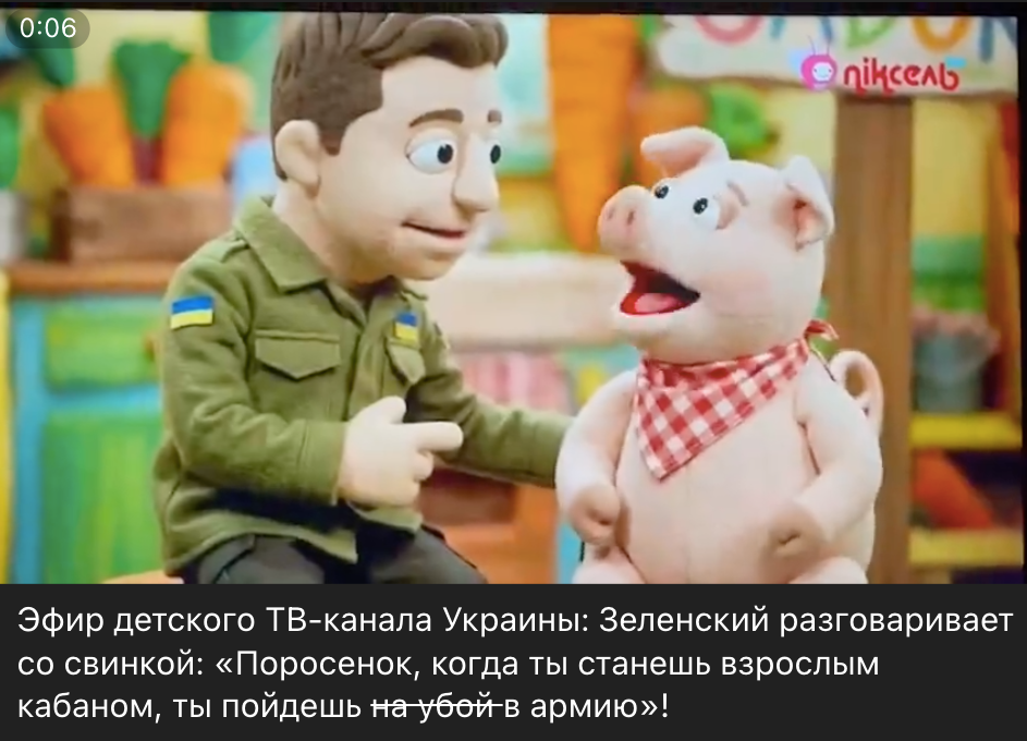 У проросійському сегменті соцмереж активно поширюється нібито уривок з дитячого мультфільму, в якому персонаж у військовій формі з нашивками у вигляді українського прапора, що дуже схожий на Володимира Зеленського, каже свинці: «Поросятко, коли ти станеш дорослим кабаном, ти підеш до армії». На думку пропагандистів, цей фрагмент доводить, що дітей в Україні з самого дитинства індоктринують та готують до служби у війську. «Маленьких українців готують до бусифікації з пелюшок», «президент уже навіть не приховує, що українці для нього — свині», «влада знущається з українців, як тільки може», – коментують ролик пропагандисти.   ​​